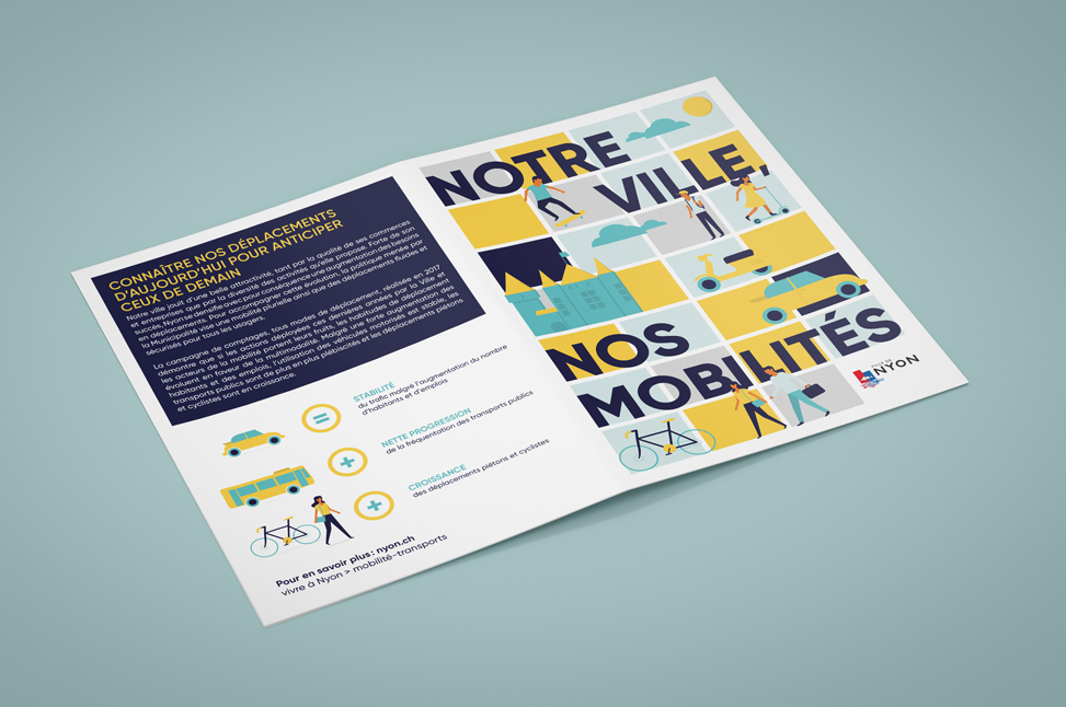 Conception de l’identité visuelle des thématiques publiques portées par le service des travaux, de l’environnement et de la mobilité de la Ville de Nyon.